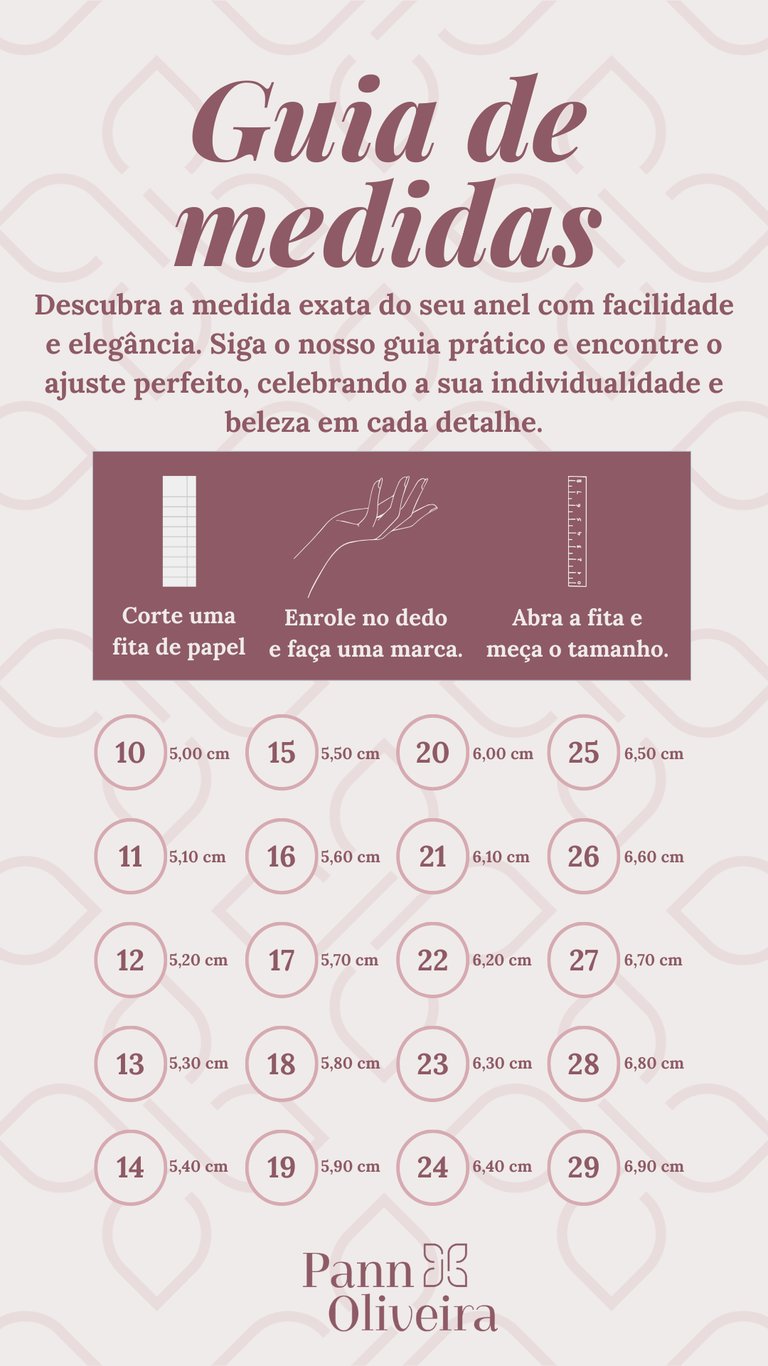 Imagem do Guia de Medidas será anexada aos produtos da nossa loja que requerem essa informação, para que você tenha ainda mais facilidade ao escolher suas semijoias Pann Oliveira.